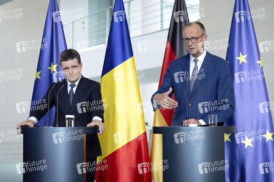 Nicusor Dan und Friedrich Merz beim Empfang des Präsidenten von Rumänien zu einem gemeinsamen Gespräch mit anschließendem Pressestatement im Bundeskanzleramt. Berlin, 18.07.2025