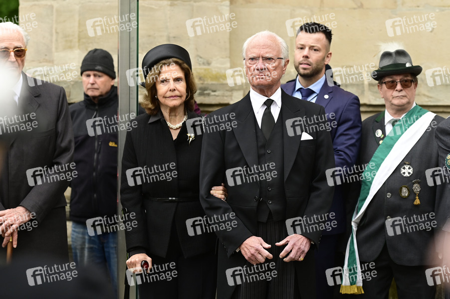 Königin Silvia von Schweden und König Carl Gustaf von Schweden bei der Trauerfeier für Andreas Prinz von Sachsen-Coburg und Gotha auf dem Schlossplatz von Schloss Ehrenburg. Coburg, 24.04.2025