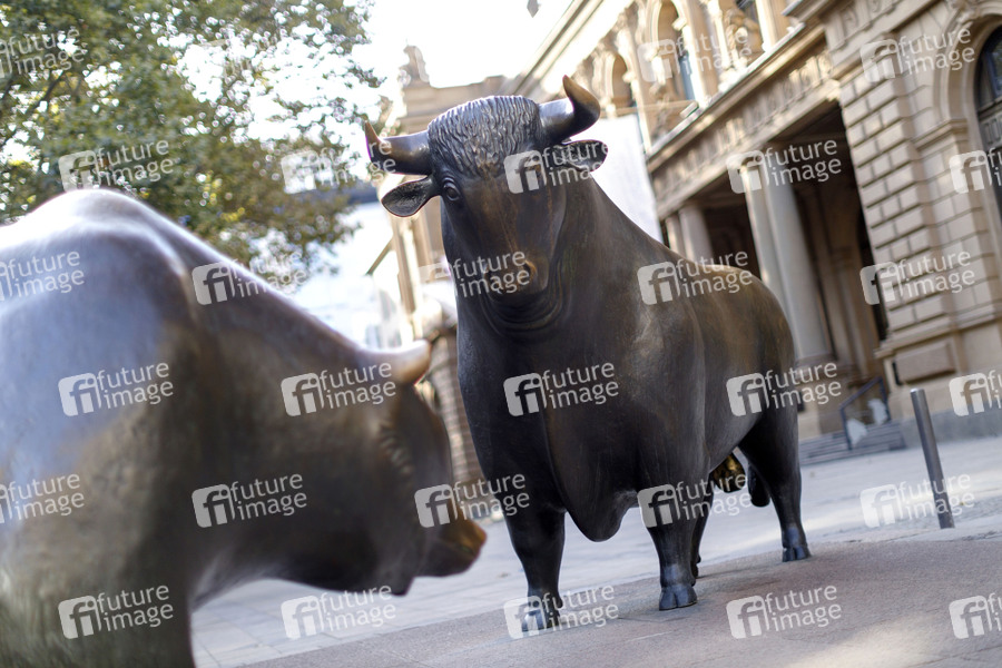 Bulle und Bär vor der Frankfurter Wertpapierbörse, wo es am Montag zu einem extremen Kurssturz kam. Bullenmarkt oder Hausse steht an der Börse für anhaltend steigende Kurse und Bärenmarkt oder Baisse für anhaltend sinkende Kurse. Frankfurt, 09.03.2020