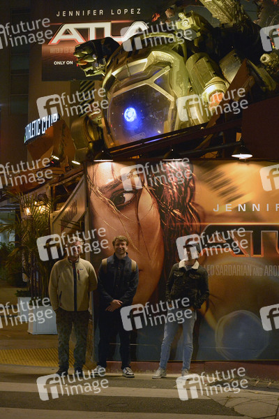 Kirt Johnson, Sam Collison und Dave Horowitz vor der Werbeinstallation zum Netlix-Film 'Atlas' am Sunset Blvd. Los Angeles, 20.05.2024