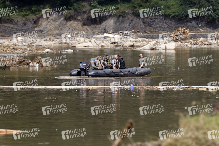 Nach dem Jahrhunderthochwasser in der Eifel durch heftige Regenfälle und Dauerregen mit Überschwemmungen und Überflutungen haben die Aufräumarbeiten im Ahrtal begonnen. Einheiten von Polizei, THW, Bundeswehr und Feuerwehr mitsamt vielen freiwilligen Helfern räumen Straßen, entfernen Schutt und Schlamm und versorgen die Menschen. Im Bild Bundeswehrsoldaten auf der Ahr in der Ortschaft Rech, in der die Flut viele Häuser zerstörte, 22.07.2021