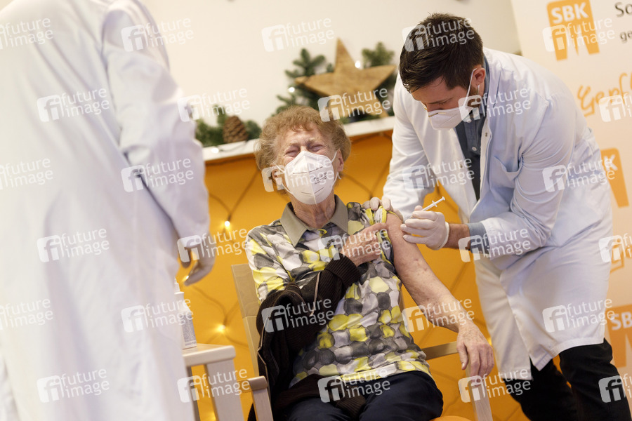 Heimbewohner beim Impfbeginn in Köln. Zum Impfstart in Köln werden Senioren und Mitarbeiter der Kölner Sozialbetriebe mit dem Corona-Impfstoff von Biontech Pfizer geimpft. Als erste Kölnerin erhielt die 92-jährige Gertrud Vogel, eine Pflegeheimbewohnerin des Seniorenzentrum Riehl das Vakzin. Köln, 27.12.2020