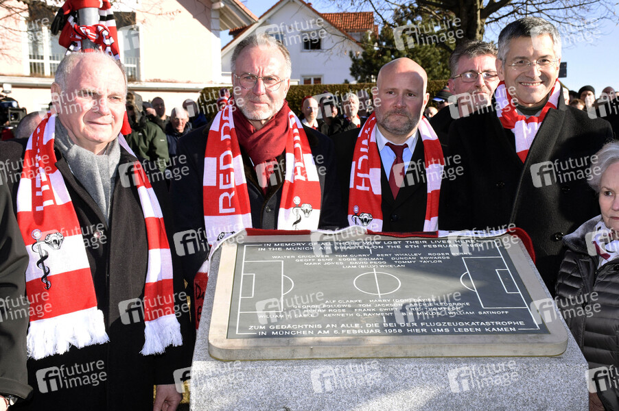 Uli Hoeneß, Karl-Heinz Rummenigge, Christian Vorländer und Herbert Haimer bei der Grundsteinlegung für eine Gedenkvitrine zum 62. Jahrestag des Flugzeugunglücks am damaligen Flughafen München-Riem, bei dem 23 Menschen ums Leben kamen, darunter acht Fußballspieler von Manchester United, am Manchesterplatz. München, 06.02.2020