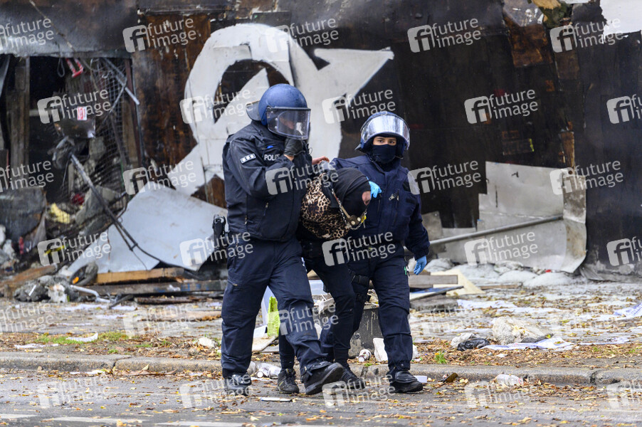 Räumung des linksautonomen Wagenplatzes 'Köpi'. Die Bewohner hatten im Vorfeld angekündigt, sie wollen nicht kampflos aufgeben. Rund eine Stunde haben die Barrikaden des linksautonomen Wagencamps gehalten, dann durchbrach die Polizei den Zaun an mehreren Stellen. Es gab Festnahmen. Berlin, 15.10.2021