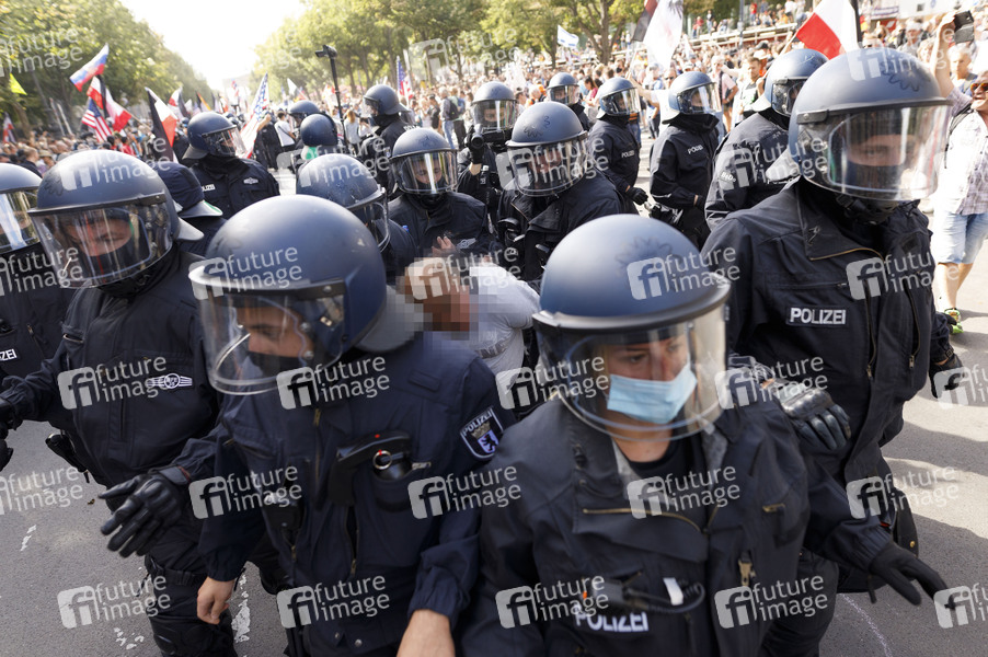 Im Bild die Demo vor der russischen Botschaft. Demonstranten verschiedener Gruppierungen wie etwa der Initiative Querdenken 711 protestierten mit einer Großdemonstration in Berlin gegen die bestehenden Maßnahmen zur Eindämmung der Corona-Pandemie. Wegen Nichteinhaltung der polizeilichen Auflagen wurde die Demonstration durch die Polizei beendet. Es gab Rangeleien und Festnahmen. Berlin, 29.08.2020