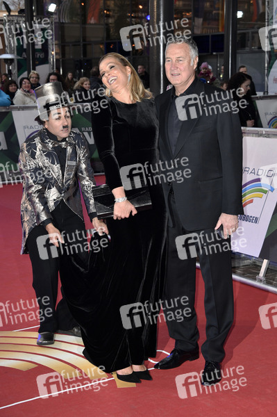 Franziska van Almsick und Lebenspartner Jürgen B. Harder mit Albert de Paris alias Charlie Chaplin bei der Verleihung des 22. Radio Regenbogen Award 2019 in der Europa-Park Arena. Rust, 12.04.2019