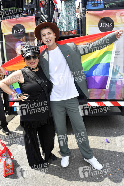Franziska Traub und Maximillian Seitz auf dem JFMS Truck von Julian F. M. Stoeckel bei der 44. Christopher Street Day Parade 2022 unter dem Motto 'United in Love! Gegen Hass, Krieg und Diskriminierung' vom Spittelmarkt auf gut sieben Kilometern über Potsdamer Platz und Potsdamer Straße zum Nollendorfplatz, von dort weiter zur Siegessäule und zum Brandenburger Tor. Berlin, 23.07.2022