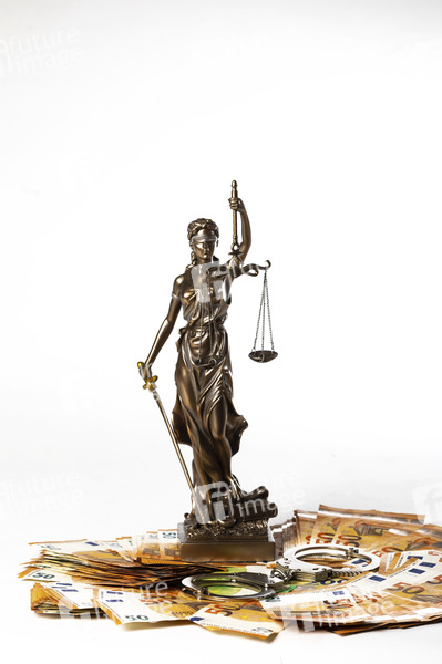 Justitia mit 50 Euro-Geldscheinen und Handschellen