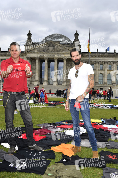 Sascha Vollmer und Alec Völkel von The BossHoss legen ihr letztes Hemd vor dem Reichstagsgebäude ab - Unter dem Motto #AlarmstufeRot protestieren Mitarbeiter der Kultur-und Veranstaltungsbranche in Berlin für Soforthilfen für die Veranstaltungswirtschaft. Durch die Schließungen und Absage von Veranstaltungen während der Corona-Pandemie stehen viele Kulturschaffende, Veranstalter, Messe- oder Bühnenbauer, Techniker und Kunstschaffende vor dem Aus. Berlin, 09.09.2020