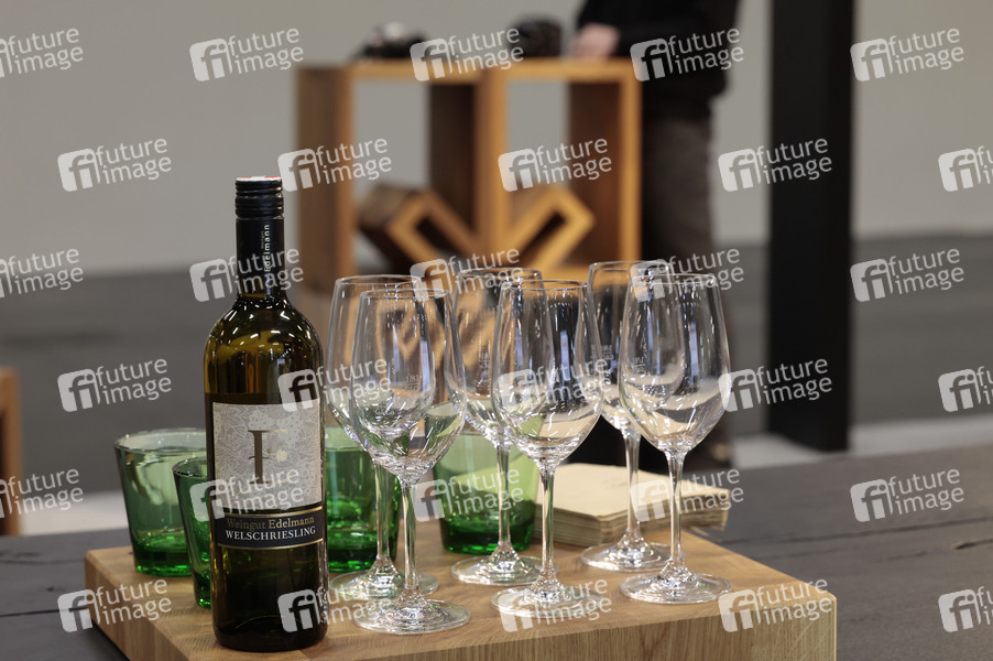 Weinglastablett aus Massivholz beim Presserundgang zur Eröffnung der imm cologne - World of Interiors, der Fachmesse für Möbel und Innenraumgestaltung, in der Koelnmesse, Köln, 20.01.2026