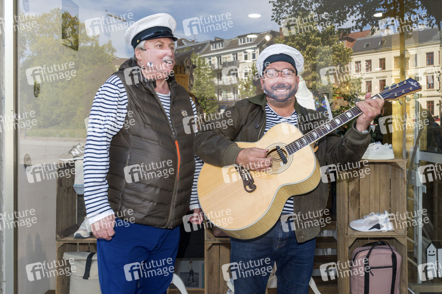 Klaus Baumgart und Claas Vogt von Klaus & Klaus beim Fototermin vor der Textildruckerei EINDRUCK, welche Mund-Nase-Masken mit dem echten Lächeln der Träger herstellt. Hamburg, 06.05.2020