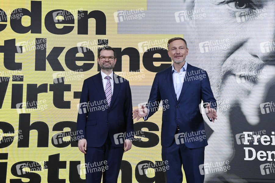 Marco Buschmann und Christian Lindner bei der Presseskonferenz der FDP zur Kampagnenpräsentation zur Bundestagswahl 2025 im Hans-Dietrich-Genscher-Haus. Berlin, 10.12.2024