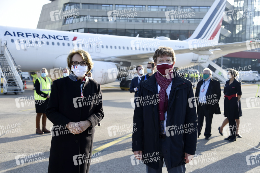 Botschafterin Anne-Marie Descotes und Flughafenchef Engelbert Lütke Daldrup beim letzten Abflug. Mit der Inbetriebnahme des Flughafens Berlin Brandenburg Willy Brandt (BER) wird der gesamte Luftverkehr der Hauptstadtregion an einem Standort konzentriert. Der Flughafen Tegel, kurz TXL, schließt am 8. November. 60 Jahre nach dem ersten Linienflug von Air France wird am 8. November ein Flugzeug der französischen Airline zum allerletzten Mal von dem Flughafen im Nordosten Berlins starten und Adieu sagen. Berlin, 08.11.2020