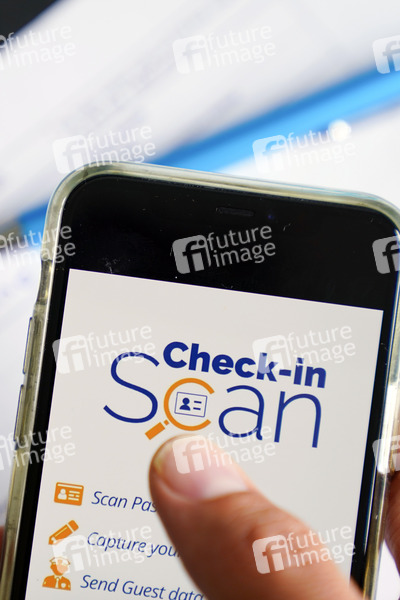 Symbolfoto, Symbolbild, Digitaler Check-In, Hotel:, Pension, Hotelerie, DEHOGA, Meldeschein, Check-In Scan, mobiles Endgerät, Digitalisierung, Hotelgewerbe, Aenderung, Zimmer, einchecken, Digitaler Schlüssel, Handy, Mobiltelefon, Illustration, Mobiles Endgerät, Innenministerium, Corona, Virus