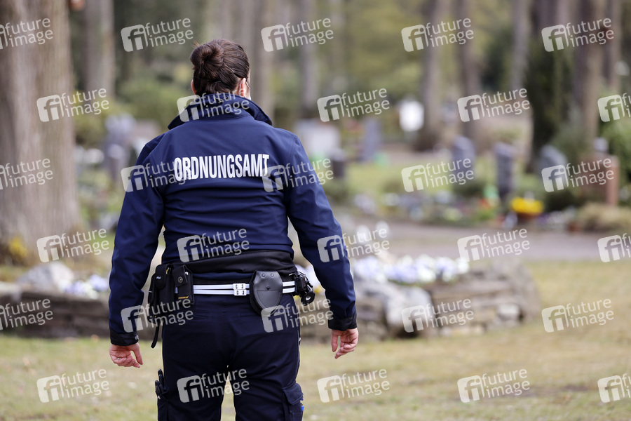 Die Stadt Leverkusen befürchtete eine größere Menschenansammlung bei der Beerdigung eines hochrangigen Clan-Mitglieds einer Großfamilie und damit Verstöße gegen die Corona-Schutzverordnung. Mitarbeiter des Ordnungsamt sichern den Eingang zum Friedhof Reuschenberg und achten darauf, dass nur angemeldete Personen den Friedhof betreten. Leverkusen, 09.04.2021