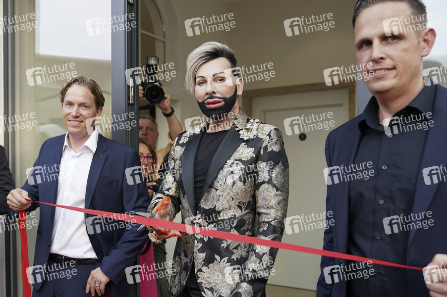 Harald Glööckler mit den Betreibern Bernd und Jochen Frey beim Pre-Opening des ersten Café Pompöös im Kurpark. Bad Dürkheim, 28.08.2019