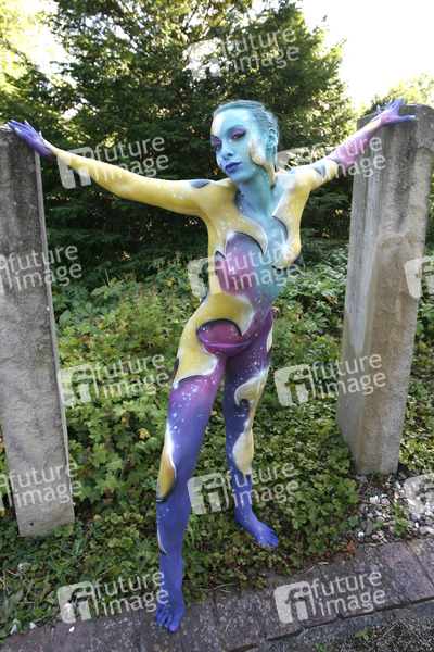 Bodypainting und Fotoshooting mit Model Sarah am Tag der offenen Tür der Meisterschule Justus-von-Liebig-Schule, Abteilung Floristik in Hannover-Ahlem. Künstler: Jörg Düsterwald