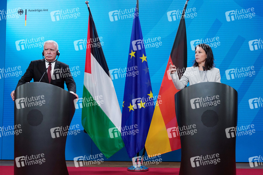 Riyad al-Maliki und Annalena Baerbock bei einer Pressekonferenz nach einem gemeinsamen Gespräch von Außenministerin Baerbock und dem Außenminister der Palästinensischen Gebiete, Riyad al-Maliki, im Auswärtigen Amt. Berlin, 13.02.2024