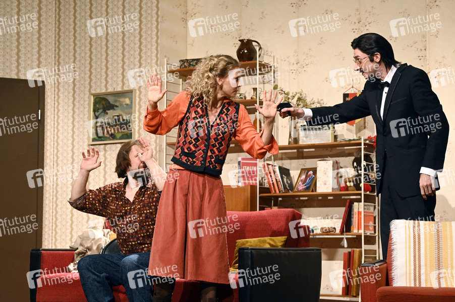Bürger Lars Dietrich, Sabine Fürst und Marc Laade bei der Fotoprobe zum Theaterstück 'Stasi, Stress und Stolperfallen' im Schlosspark Theater. Berlin, 04.09.2024